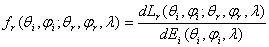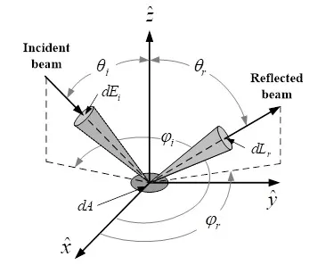 θi,φi are the incidence angles and azimuthal angles of the incident light, respectively. θr,φr are are the reflectance angles and azimuthal angles of the reflected light, respectively. Lr is the luminance of the light reflected in direction (θr,φr) after irradiating the differential element, with a unit of W/㎡·sr·μm, Ei, is the irradiance produced by incident light in the direction(θi, φi)on the surface, with a unit of W/㎡·μm.Thus, the unit of BRDF is sr-1。The physical significance of BRDF is the ratio of the luminance emitted in the(θr,φr )direction to the irradiance produced by incident light from direction(θi, φi) on the measured surface. The bidirectional reflectance distribution function is a function of incident angle(θi, φi)、reflection angle(θr,φr )、and wavelength λ ’s Function.
