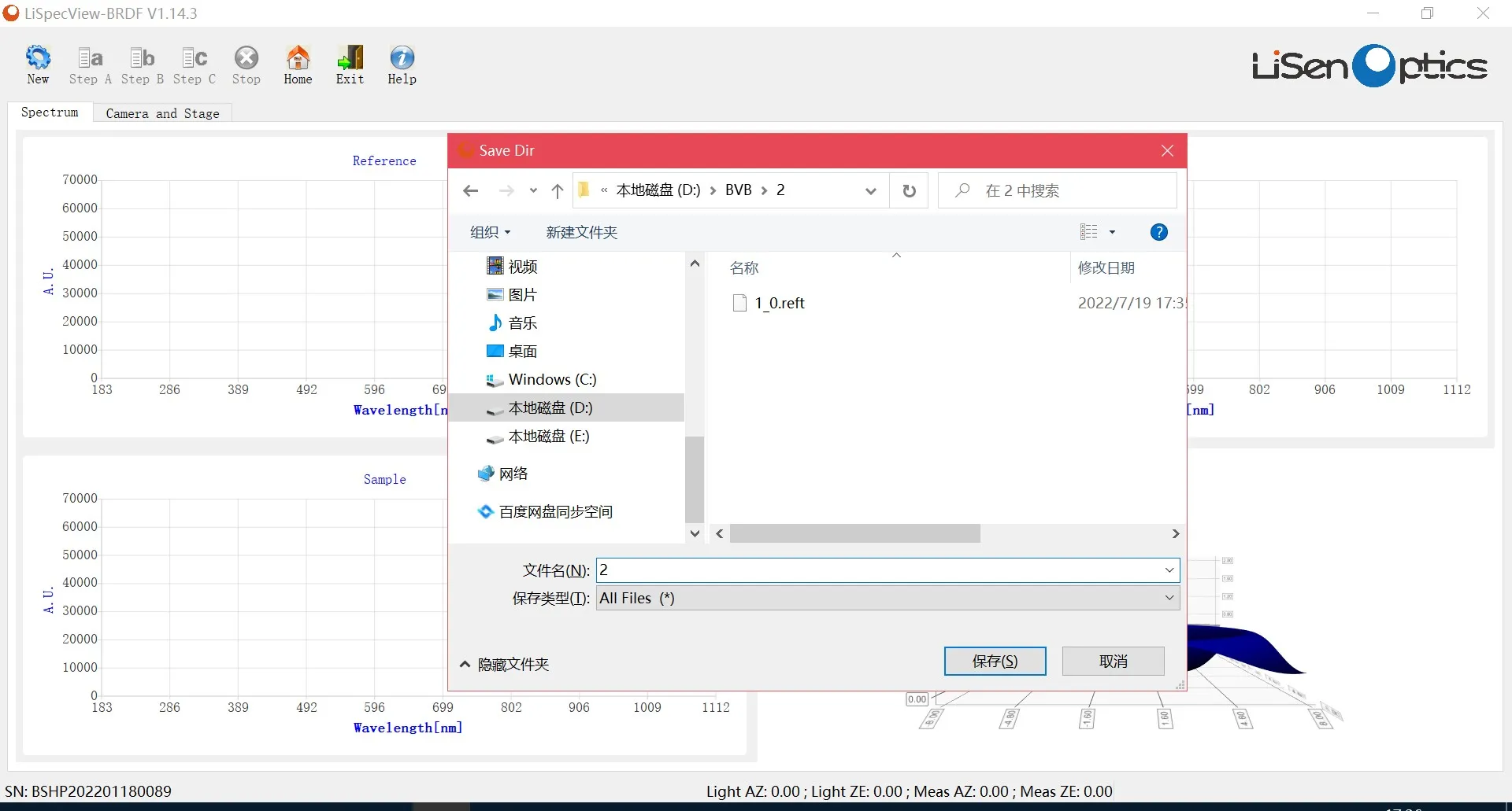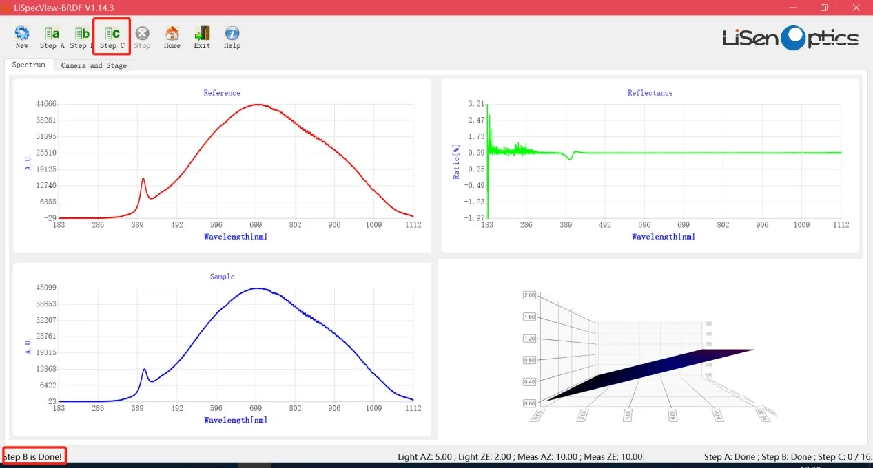 Software functions include motion platform parameter settings, spectrometer acquisition control, automatic BRDF data measurement based on preset conditions, data acquisition and storage, real-time display of sample photos, 2D spectral display, 3D light intensity distribution. |