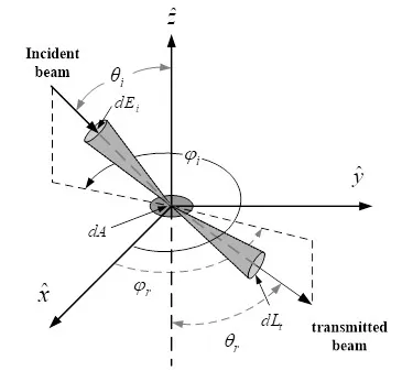 The Bidirectional Transmittance Distribution Function represents the transmittance characteristics of an object's surface under different incidence angles at any observation angle, as shown in Figure 2. The bidirectional transmittance distribution function is the ratio of light radiation's transmitted luminance to the incident irradiance. Its mathematical expression is: