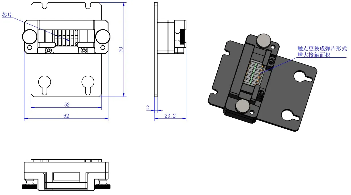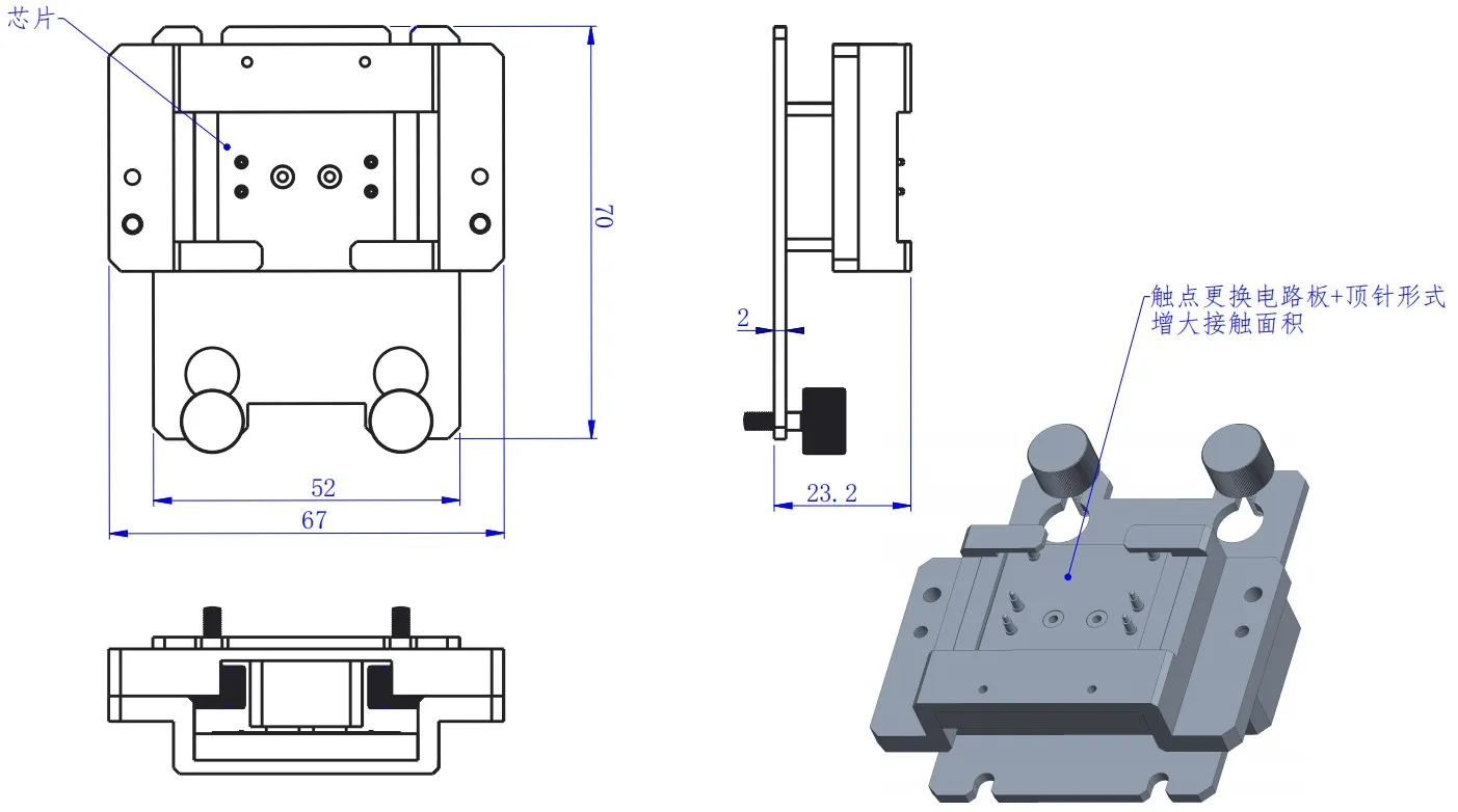 The LS-EQE-AS-SUDA01 fixture has an overall width of 67 mm, length of 70 mm, and thickness of 23.2 mm. The contact point is replaced by a top pin form and the circuit board has been replaced. This fixture tests OLED organic material chips. The outer glass encapsulation of the sample chip is 32.90 mm * 32.90 mm, with a luminescent area of 16.4 * 16.4 mm and eight electrodes. The dedicated circuit board lights up the chip to be tested. The upper part of the fixture has two hole structures for fixation, used to install in the electroluminescent quantum efficiency system for testing.