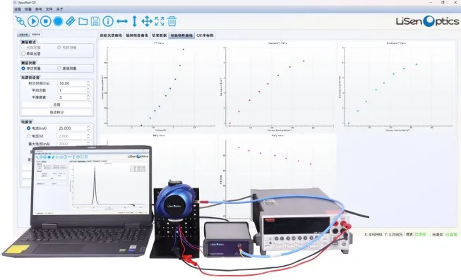 The iSpecEQE Electroluminescent Quantum Efficiency Spectroscopy System from LiSen Optics is an important member of the comprehensive photoluminescence characteristic measurement platform. It is specifically designed to effectively measure the optoelectronic properties of light-emitting devices. The system includes a spectrometer, a radiation-calibrated light source integrating sphere, a current source meter, a probe station, optical fibers, and fixtures. The spectrometer features a high signal-to-noise ratio, low stray light, and a large dynamic range, making it suitable for measuring excitation and emission light of different wavelengths and intensities, ensuring the accuracy of measurement results. Additionally, the system is equipped with powerful dedicated testing software that has a simple operation logic and quick testing process.