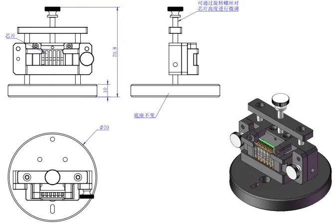 The LS-EQE-AS-SZPT02 fixture has an overall height of 70.8 mm, with a base diameter of 70 mm and height of 10 mm. The fixture has a screw on the upper part, which can be rotated to adjust the height of the chip sample to be tested, meeting different height requirements. The chip sample tested with this fixture is the same perovskite chip as in the LS-EQE-AS-SZPT01, with a luminescent area of 2 mm * 2 mm and outer glass encapsulation of 20 mm * 15 mm, with six electrodes. The leftmost electrode is the positive (or negative) electrode, and the others are negative (or positive) electrodes. The dedicated circuit board lights up the chip sample to be tested. This fixture is used for vertical measurement in the electroluminescent quantum efficiency system.