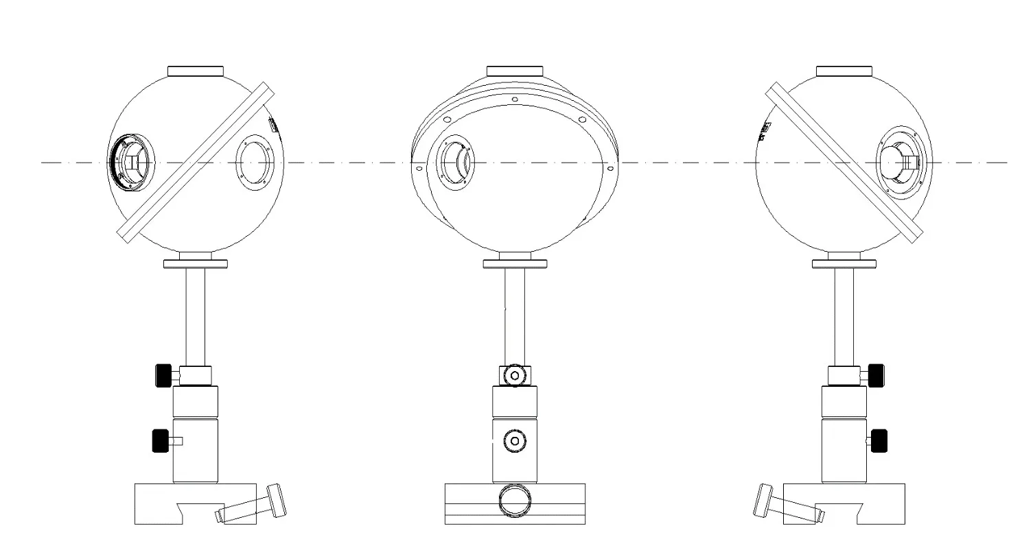 4 ports gold-plated integrating sphere, gold-plated high reflectance > 96%, spectral range 1-16μm, two ports in the direction of 0° and 90° equator of the integrating sphere, the third opening at the top, the fourth opening opposite the 0° opening, the baffle between 0° and 90° opening, the inside diameter of the integrating sphere is 2 inches, the diameter of the 0° opening is 1 inch, and the 90° opening is 0.5 inches. 180° opening 0.5 inches , the North Pole opening 0.5 inches diameter |