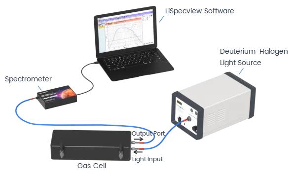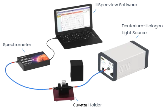 The method of measuring absorbance with a spectrometer involves passing parallel light of a certain wavelength through a flat parallel sample and detecting the light transmitted through the sample. Since a portion of the energy is absorbed by molecules in the sample, the intensity of the detected incident light is higher than that transmitted through the sample. Absorbance is widely used in spectral measurement techniques for liquids and gases for quantitative identification of substances or fingerprint authentication. It can also be integrated into industrial applications and tests of interest to customers. Using LiSen Optics' modular spectrometers, specific absorbance measurements can be selected based on different wavelength ranges and resolutions. In the lab or field, the entire optical measurement setup can be quickly configured. Based on the high-quality spectrometers from LiSen Optics, a flexible and easy-to-use combination can be made by choosing UV light sources, different optical path gas chambers, absorption cells, specific absorption path modules, and fiber probes, offering a variety of configuration options for different absorbance test