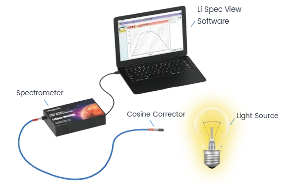 Radiant light energy can be quantified as radiant flux, which is a standard measure of the energy radiated per second (W) from a light source. Radiation measurements generally require absolute radiometric calibration of the spectrometer system with a standard light source of known spectral energy distribution. This calibration allows for radiation measurements through quantifiable parameters. Radiation energy related to human vision (photometry) can obtain the spectral luminous efficiency functions defined by the CIE, which represent the average vision of observers. Therefore, radiometric parameters, photometric parameters, and colorimetric parameters are defined in radiation measurement. Radiometric parameters mainly include irradiance μW/cm², radiance µWatt/sr, radiant flux µWatt, and photon count µMol/s/m², µMol/m², µMol/s, and µMol. Photometric parameters include lumens, illuminance Lux, and intensity Candela. Colorimetric parameters include X, Y, Z, x, y, z, u, v, color temperature, CRI color rendering index, etc.