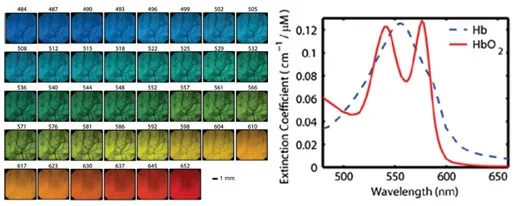 The paper titled "Hyperspectral optical tomography of intrinsic signals in the rat cortex" published in 2015 investigated the application of hyperspectral imaging in the rat cortex. The researchers discovered that oxygenated hemoglobin and deoxygenated hemoglobin exhibited sensitive variations at 529nm and 630nm, respectively. Considering the flexibility and versatility of data algorithms in hyperspectral technology, the authors developed a novel hyperspectral algorithm called DOT (Diffuse Optical Tomography) for convenient and rapid assessment of oxygen saturation in blood.
