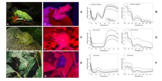 All three species of tree frogs exhibited a visually observable green coloration. However, significant differences in spectral reflectance between the species were observed between 700 and 1100nm, allowing for species differentiation.