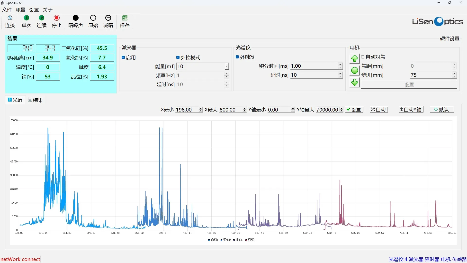 (2) It enables real-time display of LIBS spectral curves, saving and exporting spectral data, and uploading final analysis results (contents of Fe, CaO, SiO2).