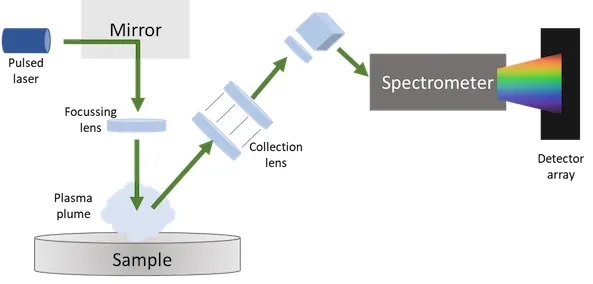 As illustrated, a LIBS analyzer typically consists of a laser, a laser focusing optical system, a spectra collection optical system, and a high-resolution spectrometer. Additionally, it often includes a specially designed timing control system, a sample chamber, and data analysis software.
