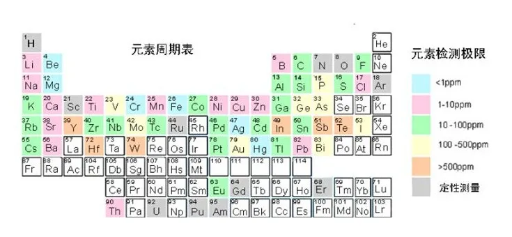 ● Detection Limits: Most elements have detection limits ranging from 10 ppm to several dozen ppm.