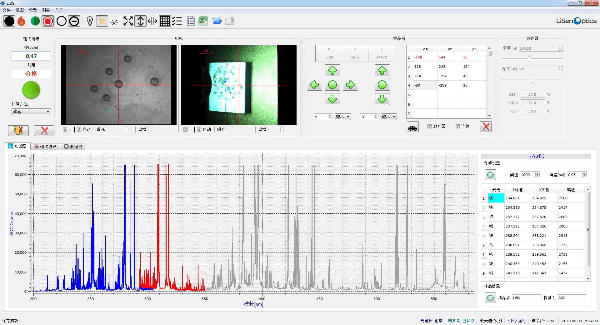 LIBS spectral data collection software, which allows control of various parameters including the sample stage, laser, focusing, and imaging, as well as other adjustments and control operations. |