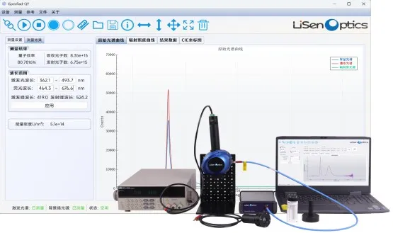 The system includes a spectrometer, integrating sphere with a calibrated radiation source, laser light source, optical fibers, and accompanying fixtures. The LiSen Optics spectrometer has a high signal-to-noise ratio, low stray light, and a broad dynamic range, making it suitable for measuring different wavelengths and intensities of excitation and emission light. The system also includes powerful, dedicated testing software, which is simple to use and facilitates quick and convenient testing processes.