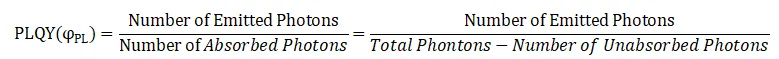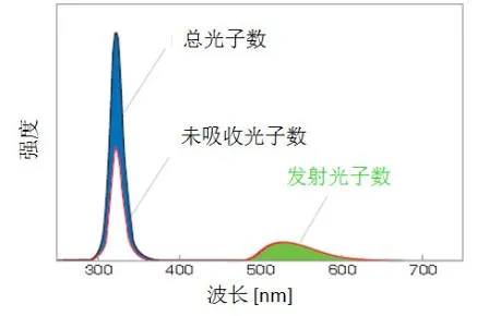 In current research on photoluminescent materials, the calculation of fluorescence quantum efficiency is crucial as it reflects the light-emitting capability of the materials. Fluorescence quantum efficiency, also known as quantum yield of fluorescence or fluorescence efficiency, is an important characteristic. Typically, the quantum yield is calculated by first exposing a blank container to the excitation light to obtain the total photon count. Then, a sample is placed in the container and exposed to the excitation light to determine the number of unabsorbed photons and emitted photons. The absolute Photoluminescence Quantum Yield (PLQY) is calculated by the ratio of emitted photons (in the green area)