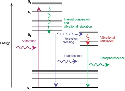 The energy diagram for fluorescence and phosphorescence absorption and emission processes describes the electronic energy levels of typical organic molecules and the electronic transitions between these levels. S0, S1, and T1 represent the ground state, lowest singlet, and lowest triplet states, respectively. After photoexcitation, excited-state molecules can return to the ground state through various radiative (involving light emission, like fluorescence and phosphorescence) and non-radiative (internal conversion and intersystem crossing) processes. Radiative and non-radiative processes compete with each other.