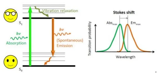 The absorption and emission energy diagram for fluorescence and phosphorescence explains the process of electron transitions in ordinary organic molecules. The energy levels S0, S1, and T1 represent the ground state, the lowest singlet state, and the lowest triplet state, respectively. After photoexcitation, excited-state molecules can return to the ground state via several transition paths, including radiative processes (like fluorescence and phosphorescence) and non-radiative processes (internal conversion and intersystem crossing). These radiative and non-radiative processes compete with each other.