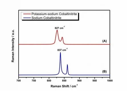 Raman Spectra of Sodium Cobalt Nitrite Solution (Blue) & Sodium Potassium Cobalt Nitrite (Red)