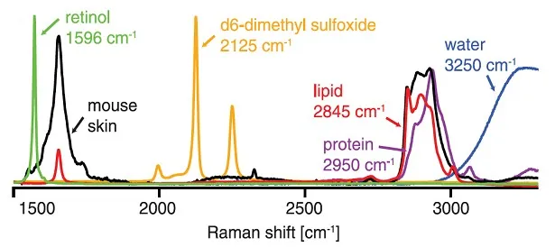 An energy level diagram visually displays various energy levels corresponding to Raman signals, with line thickness roughly indicative of signal magnitude.
