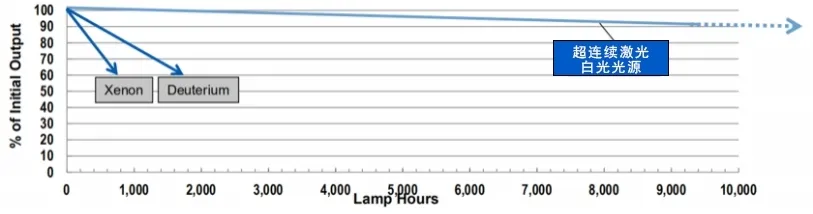 Traditional sources like arc lamps, xenon lamps, and argon lamps are limited in brightness, UV power output, and lifespan due to the use of electrode-coupled plasma generation. In contrast, the supercontinuum laser white light source employs electrodeless laser-driven technology, which allows for efficient light collection. This technology can provide exceptionally high luminance over a broad spectral range—from deep ultraviolet to visible light and beyond—extending the life of the light source by an order of magnitude compared to conventional sources.